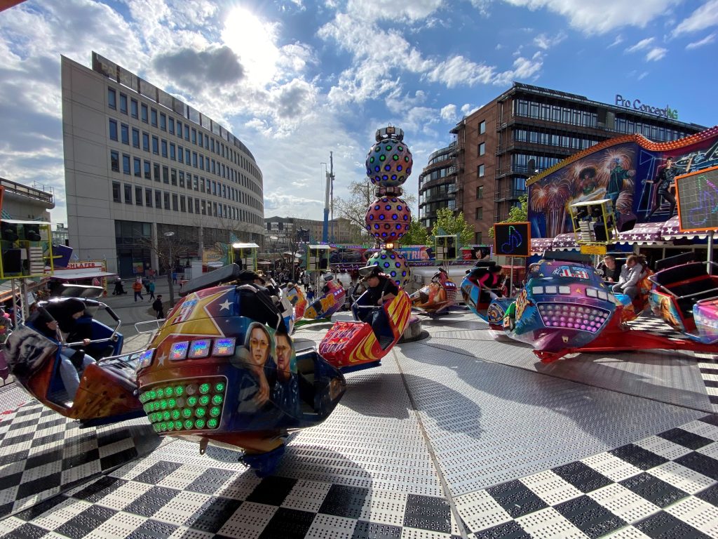 Insgesamt sechs Fahrgeschäfte bieten den großen und kleinen Gästen der Frühjahrsmass vergnügliche und rasante Rundfahrten. Täglich von 11 bis 22 Uhr erwartet die Besucherinnen und Besucher auf den Berliner Platz ein vielseitiges Volksfestangebot, das den Start in die warme Jahreszeit mit geselligem Freizeitvergnügen begleitet.