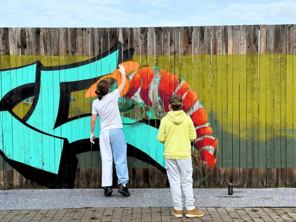 Unter fachkundiger Anleitung von Philipp Himmel lernten die Teilnehmenden die Grundlagen der Graffiti-Technik – vom Umgang mit Sprühdosen und Caps über die Gestaltung von Outlines bis hin zu individuellen Schriftzügen. Auch die Geschichte der Street Art wurde thematisiert, bevor die Jugendlichen ihre eigenen Entwürfe auf Papier entwickelten und diese anschließend direkt am Bauzaun umsetzten.